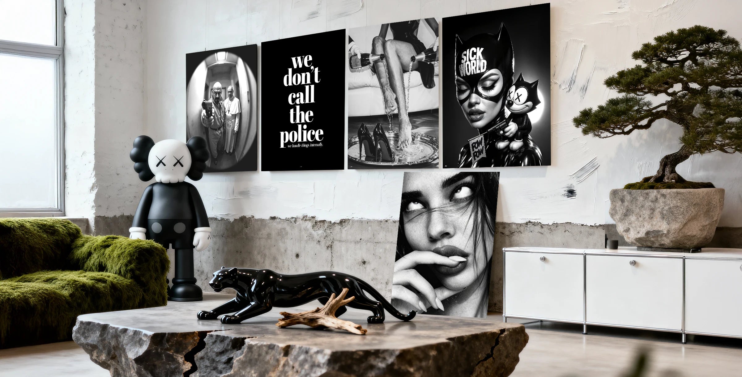 Unsere Artworks passen in minimalistische Lofts genauso wie in kreative Studios, moderne Büros oder urbane Cafés. Sie bringen Farbe, Haltung und Energie in deine Einrichtung. Kein seelenloser Druck von der Stange, sondern durchdachte Kompositionen mit Tiefe, Wucht und grafischer Power. Du willst dein Wohnzimmer in eine Popkultur-Galerie verwandeln? Dein Home Office in eine Ideenmaschine? Deine Küchenwand zum politischen Statement machen? Bei uns findest du das passende Werk.
