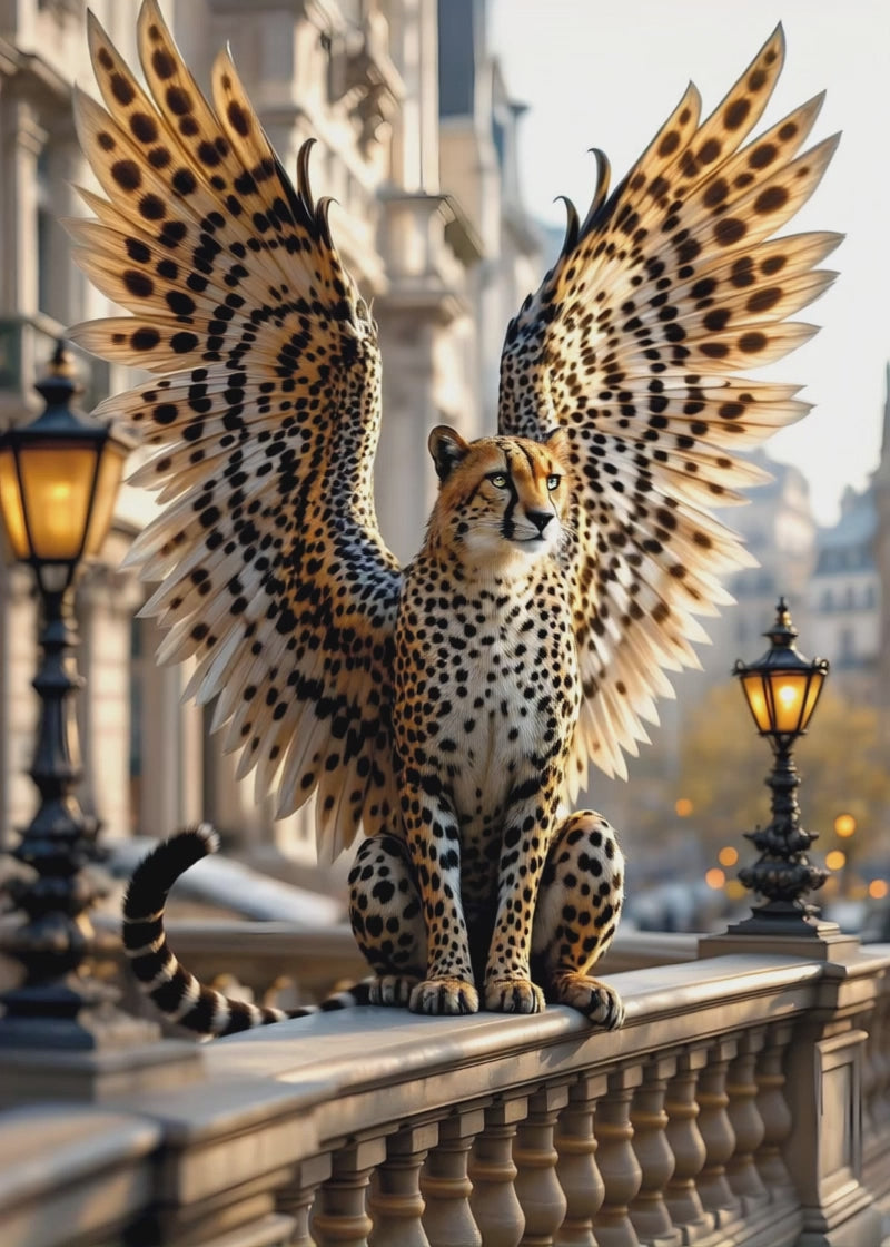 Dieses atemberaubende Kunstwerk vereint Geschwindigkeit, Anmut und grenzenlose Freiheit in einer surrealen Vision. Ein majestätischer Gepard, gekrönt mit prachtvollen Flügeln, thront über einer eleganten Stadtlandschaft – eine perfekte Symbiose aus Wildheit und Erhabenheit. Seine durchdringenden Augen strahlen Entschlossenheit aus, während die detailreichen Muster seiner Federn ihn wie einen mythischen Wächter der Lüfte erscheinen lassen.